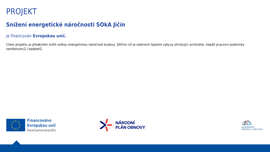 Projekt snížení energetické náročnosti SOkA Jičín administrator 30 června, 2025 SOA Hradec Králové – celý archiv Navigace pro příspěvek Previous Předchozí příspěvek Smlouva o úschově archiválií s Biskupstvím královéhradeckýmNext Další příspěvek Aktualizace prezentačního webu ARchiv ONline k 16. 7. 2025